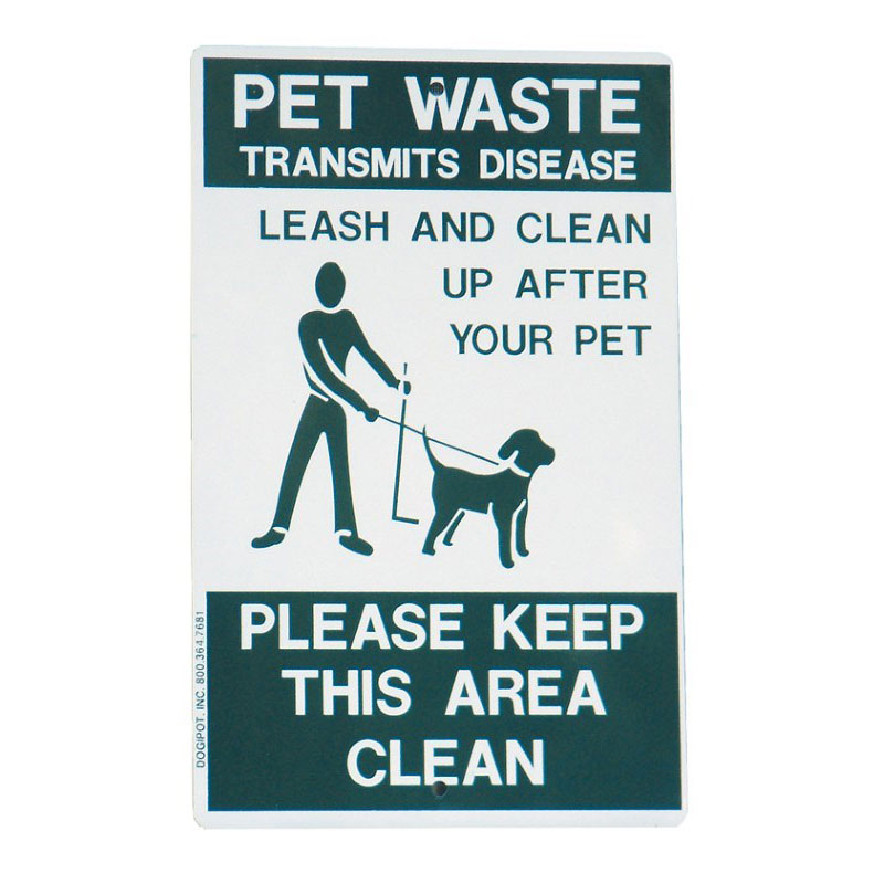 - Sign reads “PET WASTE TRANSMITS DISEASE – LEASH AND CLEAN UP AFTER YOUR PET – PLEASE KEEP THIS AREA CLEAN”
