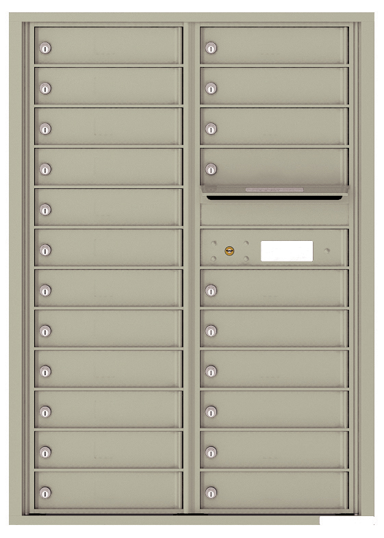 This 4C mailbox features twenty-two standard size (3.25" high) tenant slots and one outgoing mail slot. The outgoing compartment has a weather protection hood and anti-fishing comb, reinforced collection doors, heavy-duty stainless steel latching hook cams on every tenant door, and solid aluminum interlocking seams, built to prevent break-ins.