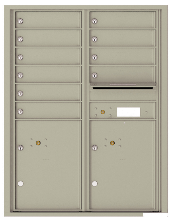 This 4C versatile™ mailbox from US Mail Supply holds ten tenant slots and two parcel lockers, perfect for an apartment, army base, large office building, or campus dormitory. Easily mounted on any indoor wall, eleven-door high ten tenant 4C horizontal mailboxes feature ten standard size (3.25” high) tenant doors, two extra-large (17" high) parcel lockers, and one outgoing mail slot. The 4C locking pre-USPS approved mailbox is available in front loading style only.