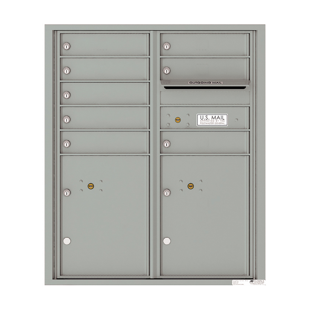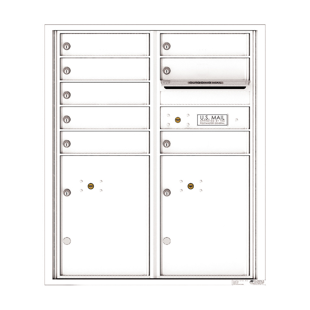 ADA compliant eight-tenant 4C horizontal mailboxes feature eight standard size (3.25” high) tenant doors, two extra-large (17” high) parcel lockers, and one outgoing mail slot.