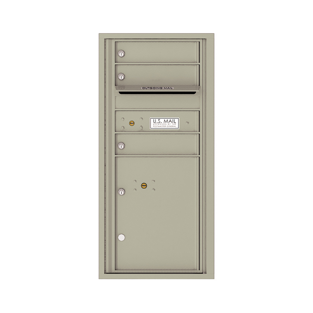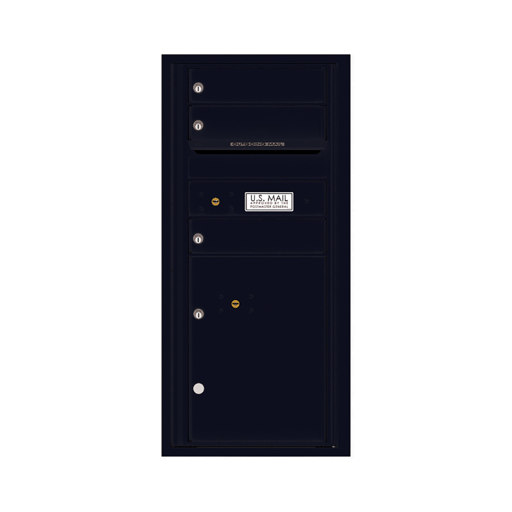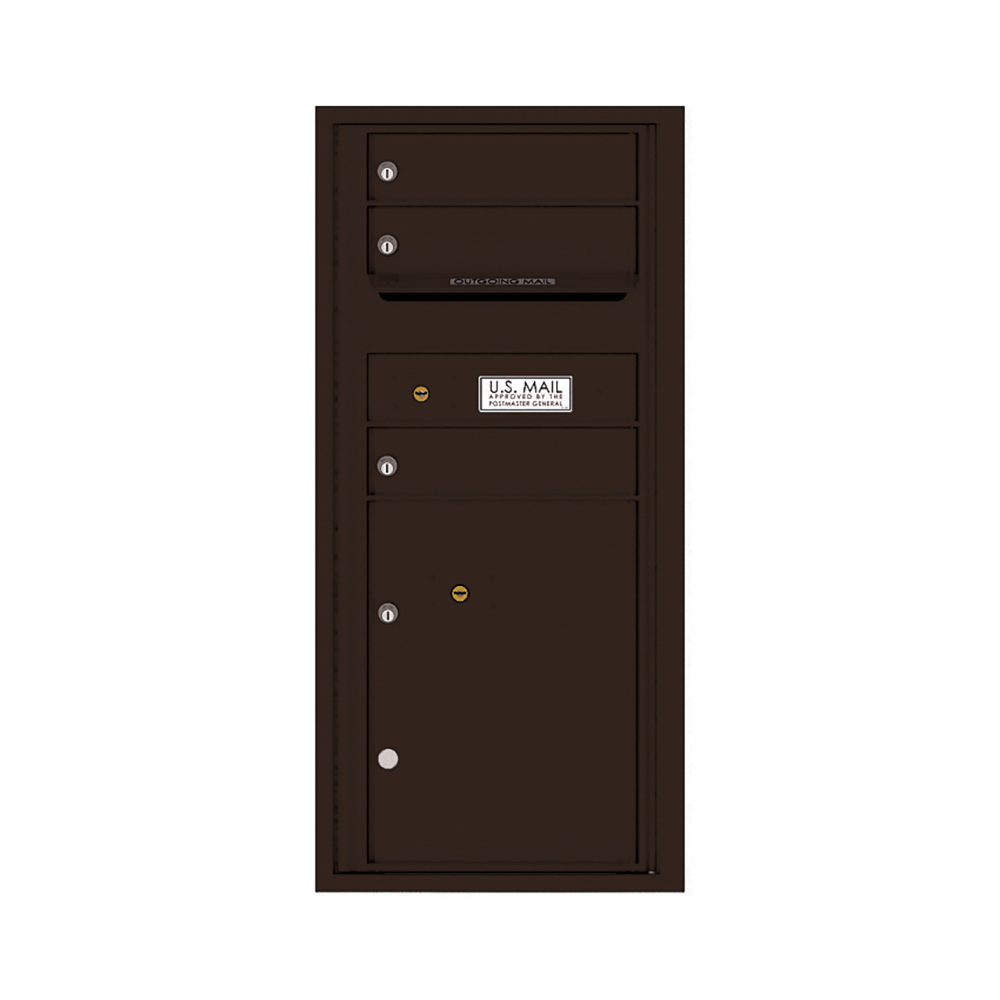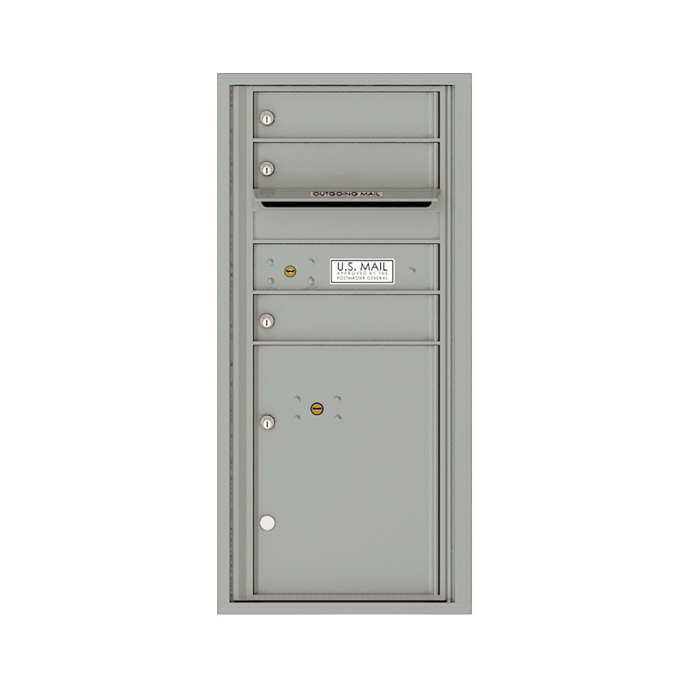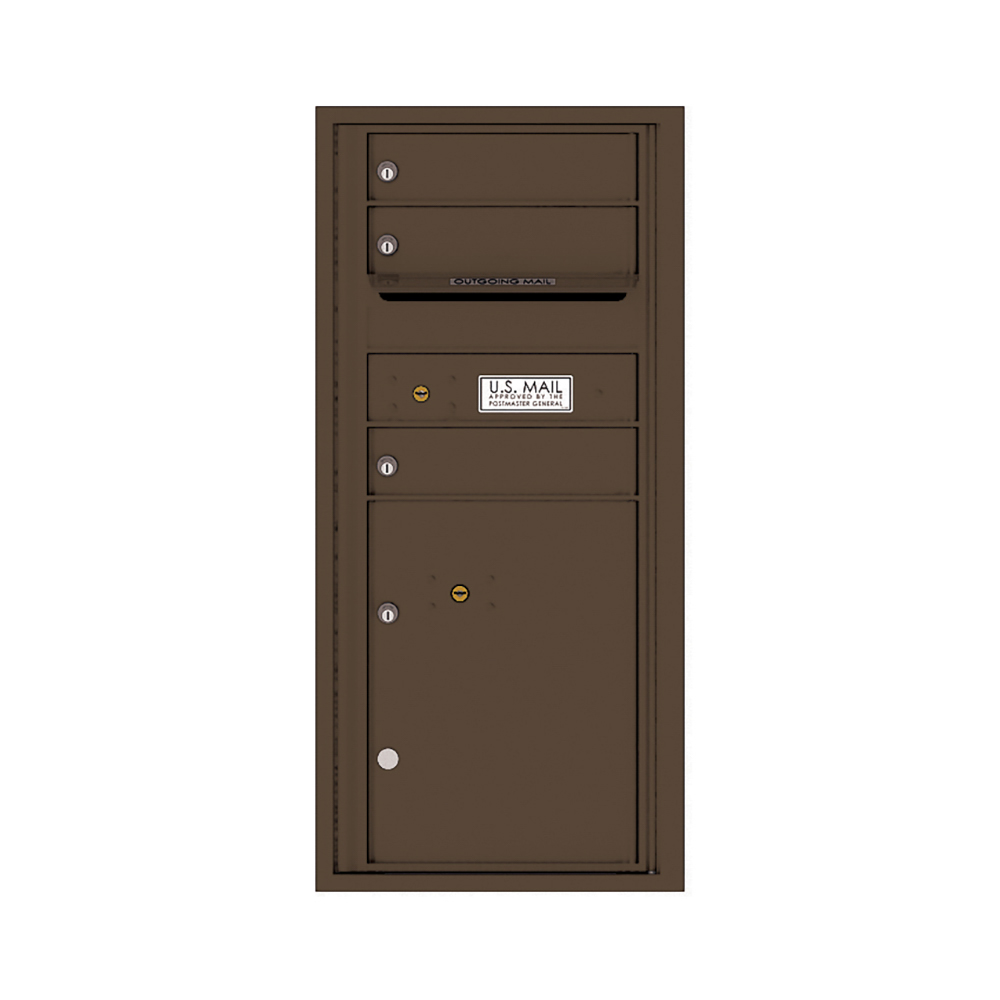 ADA compliant three-tenant 4C horizontal mailboxes feature three standard size (3.25” high) tenant doors, one extra-large (17” high) parcel locker, and one outgoing mail slot.