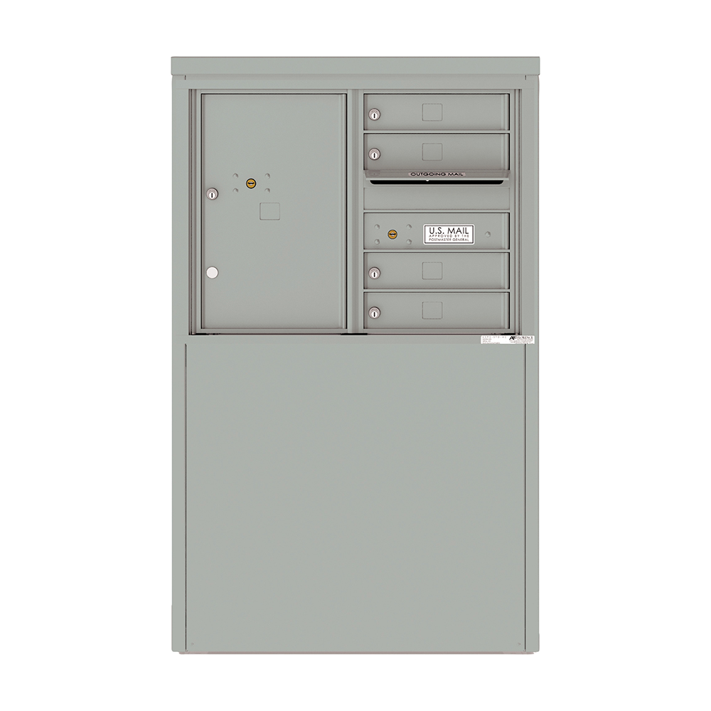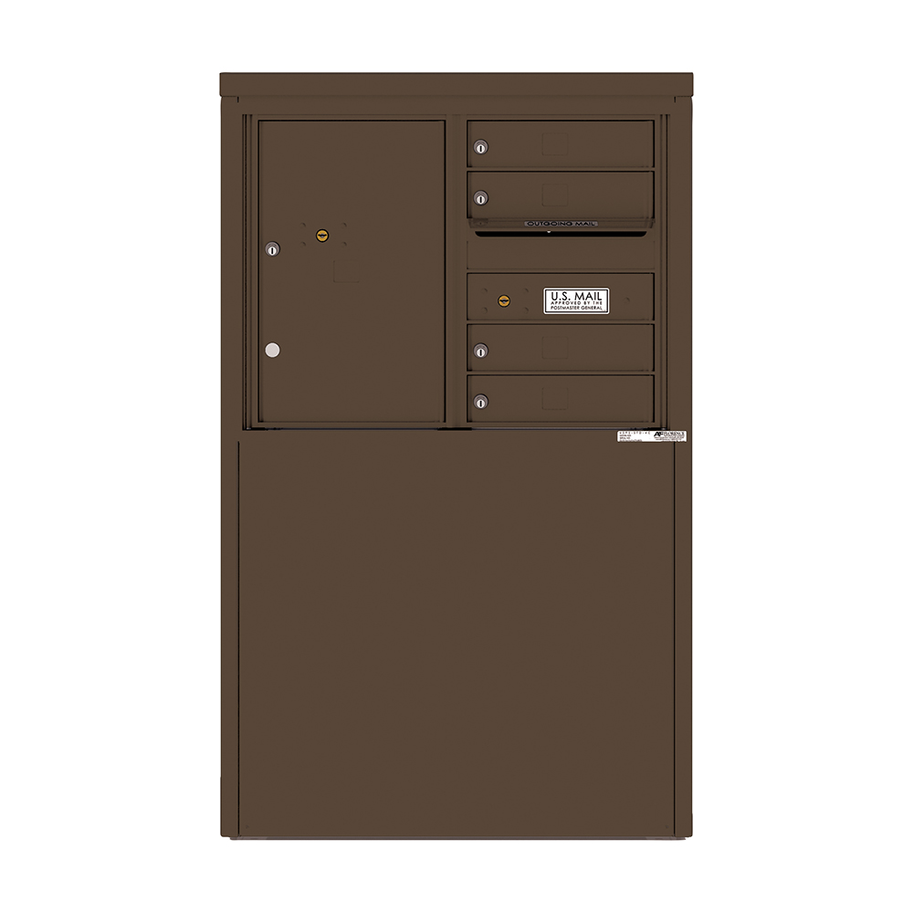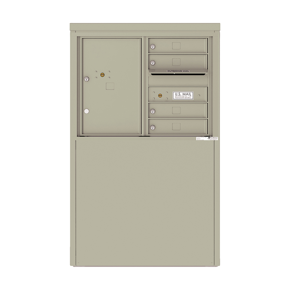 This four-tenant 4C depot mailbox from U.S. Mail Supply features four mail slots, one outgoing mail slot, and one parcel locker. This 4C mailbox is ideal for installation outside commercial or residential properties.