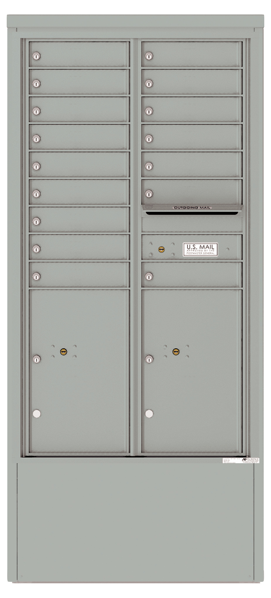 Featuring sixteen standard-sized (3.25” high) tenant doors, two oversized (20.5" high) parcel lockers and one outgoing mail slot, the 4C mailbox from US Mail Supply is perfect for military bases, college campuses, or apartment complexes. Need the same number of slots with less space for packages? We have models available without parcel lockers and with standard-sized parcel lockers. You can also keep the parcel lockers the same size and choose an indoor mailbox instead. While officially USPS approved for private use only, the 4C Horizontal Depot mailboxes can accept USPS mail delivery following approval by the local postmaster. The 4C locking private-use mailbox is available in front-loading style only.